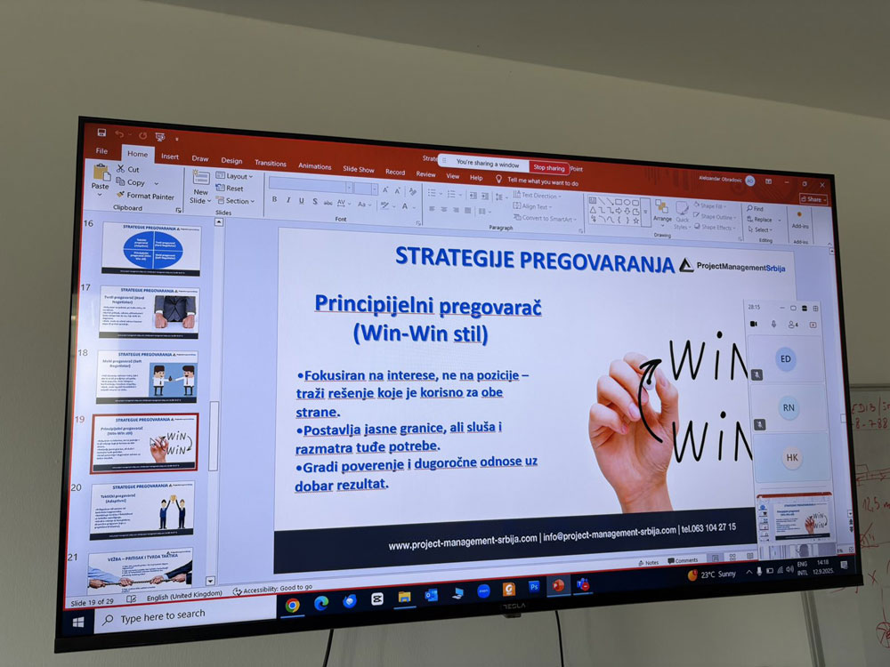 Ovladćeš tehnikama i veštinama uspešne komunikacije. Naučićeš kako da budeš jasan i precizan u komunikaciji. Naučićeš pažljivo i aktivno da slušaš, kao i na koji način da daš, ali i zatražiš povratnu informaciju od sagovornika.