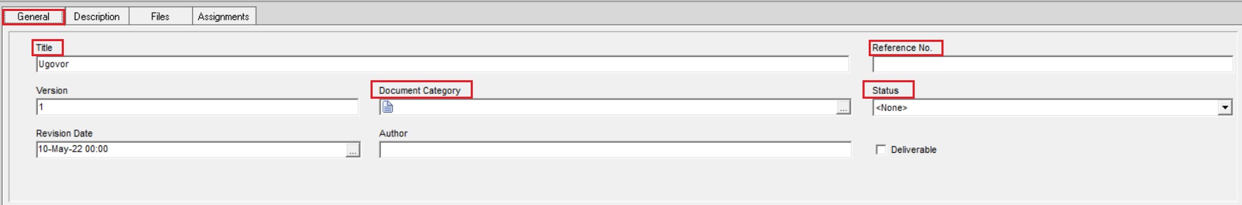 - U novi red unesite naslov dokumenta ili radnog proizvoda – title, broj reference – reference no., status – status i kategoriju dokumenta – document category