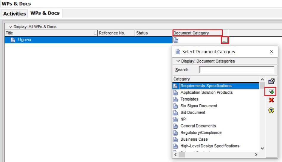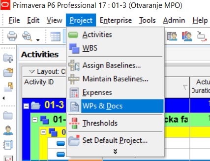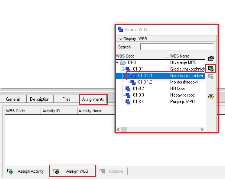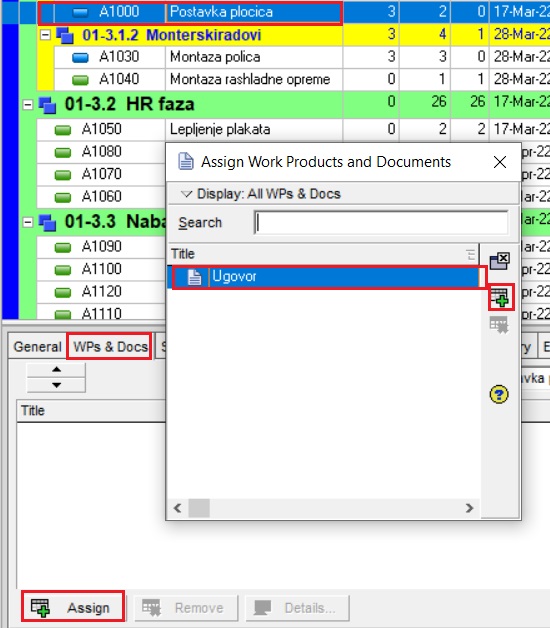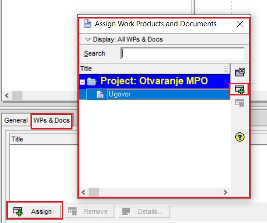 Zatim u donjem delu prozora, na kartici WPs&Docs odaberite Assign i izaberite dokument odnosno radni proizvod koji želite da vežete za WBS element.