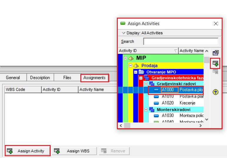 Sa kartice Assignments odaberite ili Assign Activity ili Assign WBS a zatim odaberite i konkretnu aktivnost odnosno WBS element kome želite da dodate određen dokument.