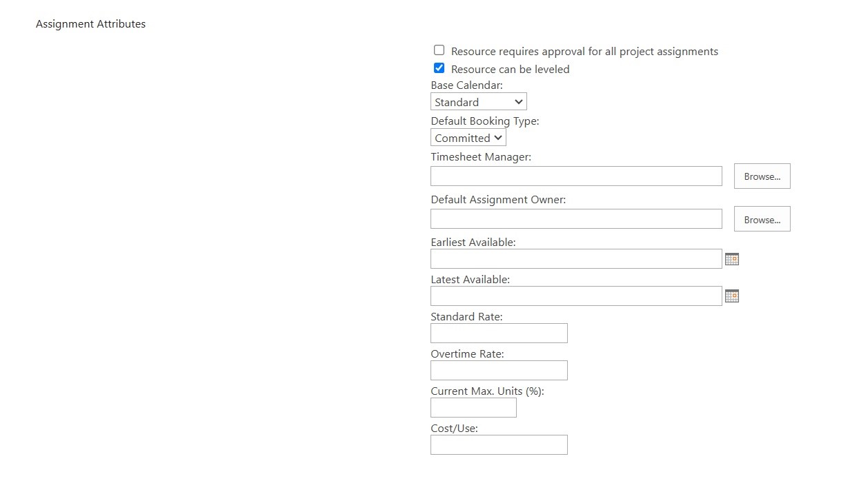 • Timesheet Manager – Otkucajte ime osobe koja odobrava ili odbija rasporede ovog resursa ili kliknite na Browse da biste izabrali menadžera rasporeda sa liste. Resursi možda nemaju zasebne menadžere rasporeda.