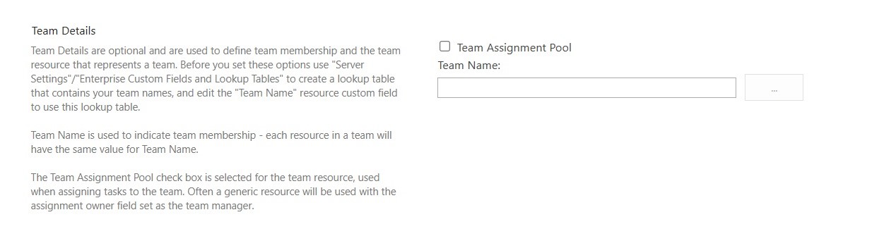 9. U odeljku Team Details – Detalji tima kliknite na dugme pored polja Team Name – Ime tima i izaberite kom timu pripada resurs, ako je potrebno.